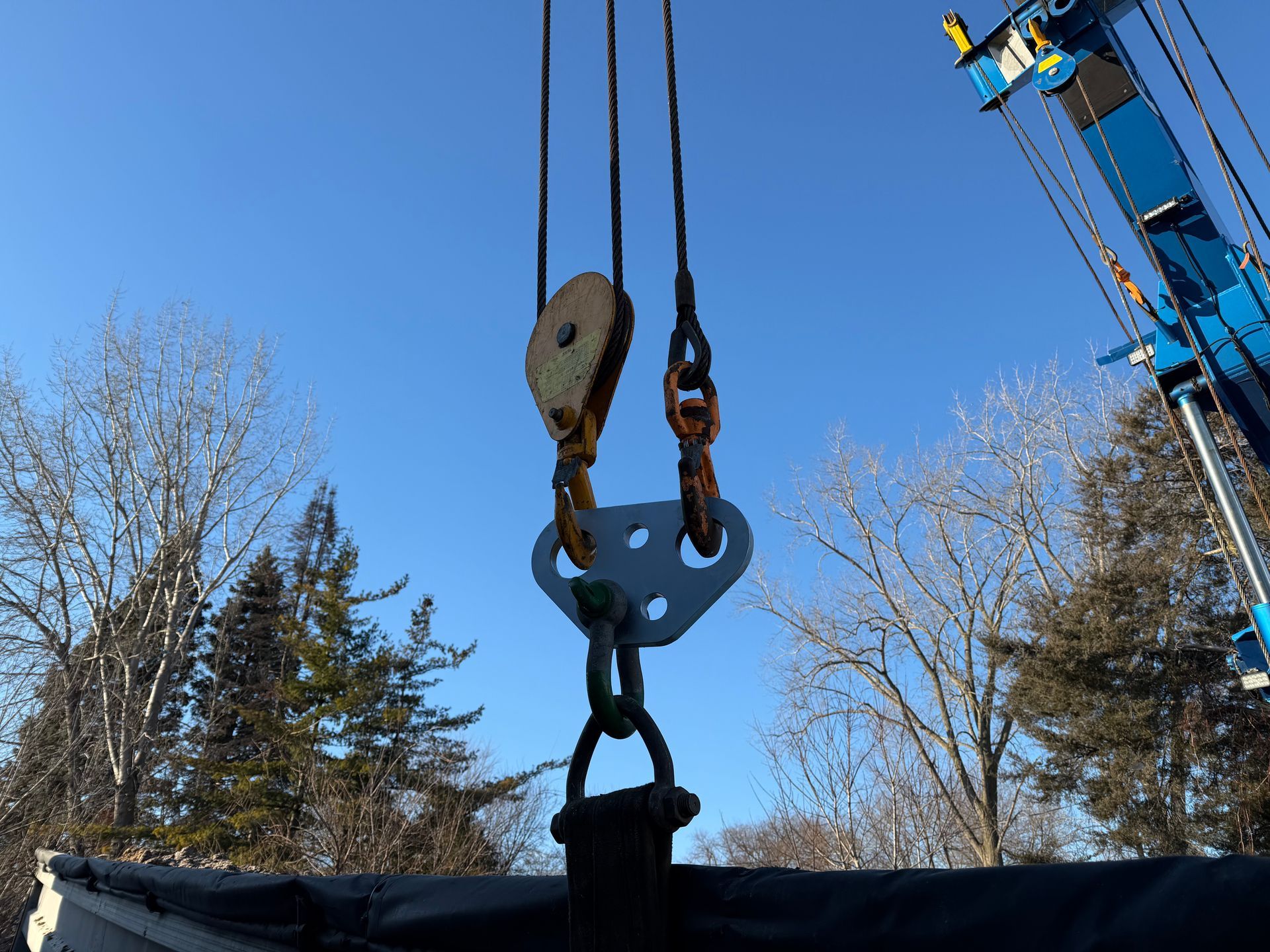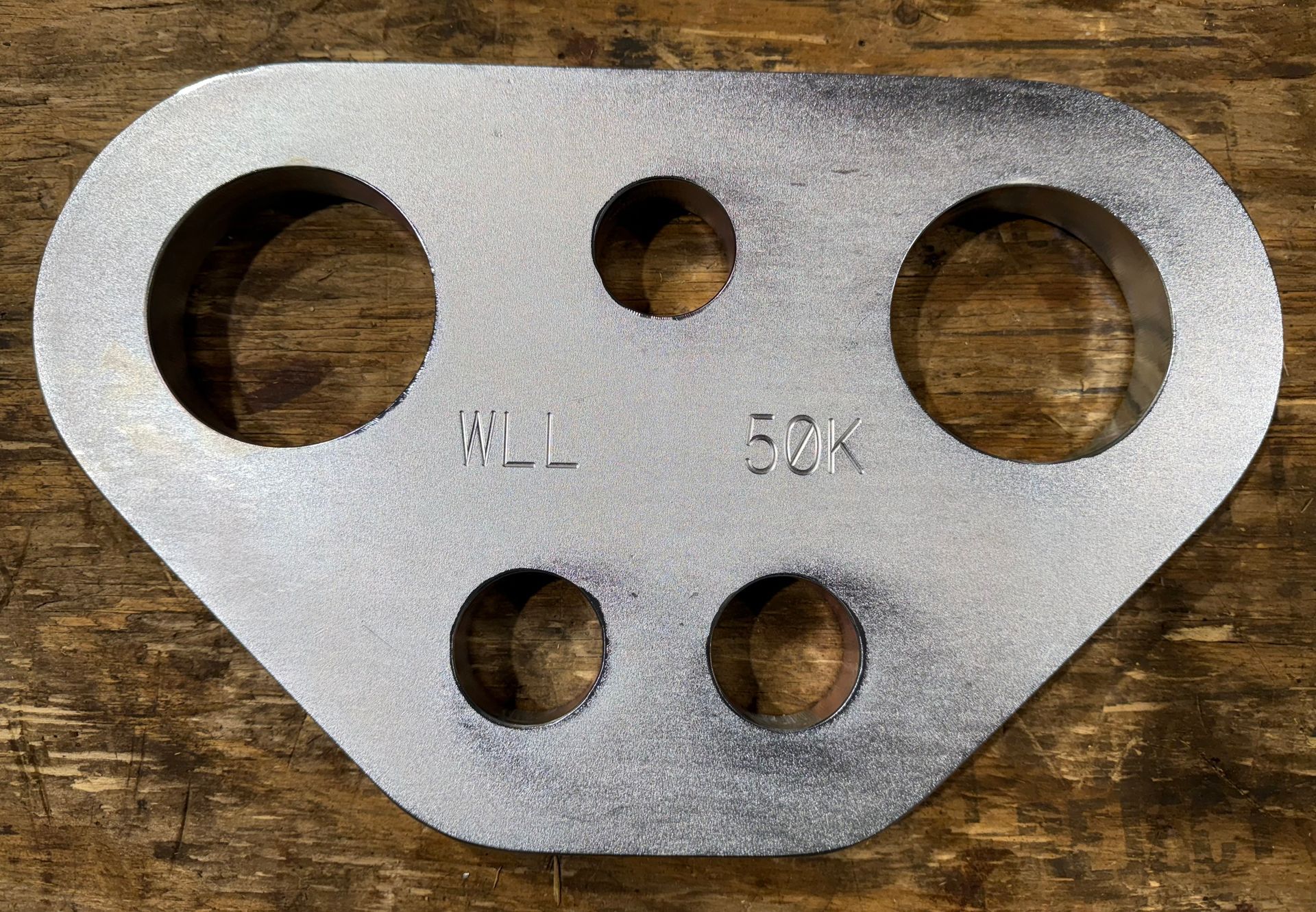 We offer lifting plates rated at 50,000 lbs WLL. These plates are engineered to work great for 3 part lines, and are perfectly balanced to have a snatch block on one side and the single hook on the other side. ($250 Single or $475 / Pair)